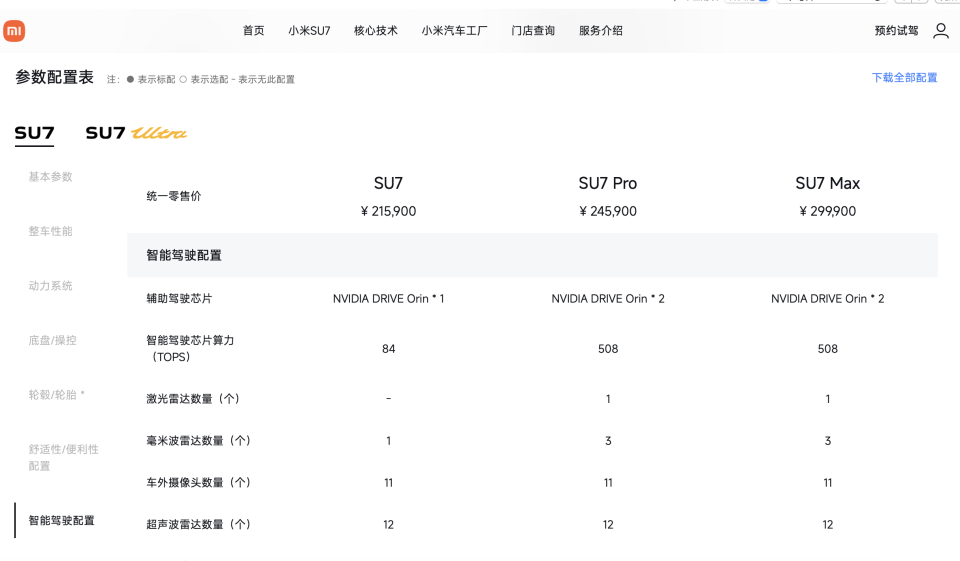 据小米汽车官网,SU7标准版的智驾硬件配置包括1颗英伟达 DRIVE Orin 芯片、1个毫米波雷达、11 个车身摄像头、12 个超声波雷达。小米SU7 Pro版和Max版则在上述配置基础上搭载了一颗激光雷达。